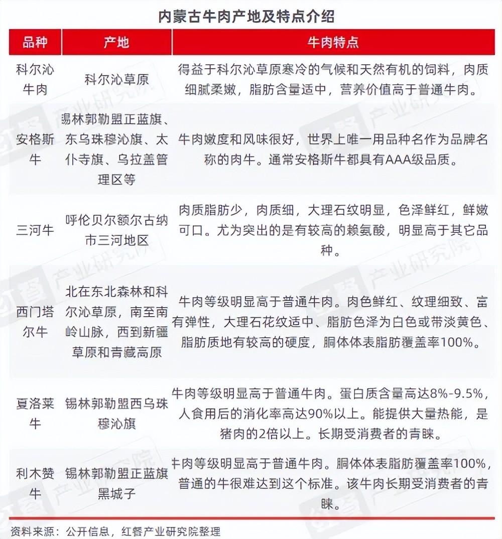 牛肉产地直接影响着肉质的品质与口感,不同的饲养环境和方式会带来不同的风味特点。下面,红餐产业研究院特意整理汇总了内蒙古地区比较有特色的牛品类,如科尔沁牛、安格斯牛、三河牛、西门塔尔牛、夏洛莱牛、利木赞牛,以供选购牛肉时参考。