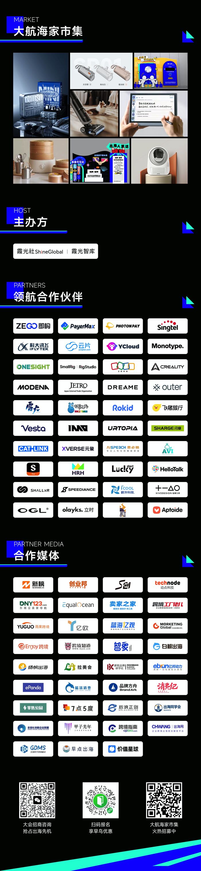 齐聚优质服务商和数十家知名出海品牌,12月5日 9:00 起,「大航海家市集」欢迎您来打卡。您将在市集看到数十家知名品牌的领航产品,以及众多了解细分领域的服务商。更有出海人树洞、出海人接头点等创意环节,让市集出海又出片!