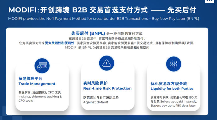 BNPL(Buy Now Pay Later),即“先买后付”,先支付小额费用拥有商品或服务再分期偿还剩余金额的新型支付方式,广泛应用于B2C领域,而MODIFI是首家将这一支付方式带到B2B领域的服务商。