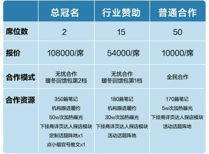 2. 招商名额共67个,分总冠名、行业赞助、普通合作三档,不同档位报价和资源不同,总冠名资源最丰富,包括350篇笔记、50万次加热曝光、下挂商详页达人探店模块权益、定制话题阵地和推送点小福官号各一次。