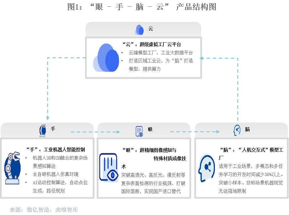 其中,“眼”指的是超精细视觉感知模组,能够实时感知工业环境的变化;“手”指的是工业机器人,能够执行各种复杂的操作任务;“脑”指的是工业AI算法,能够对感知到的信息进行智能处理和分析;“云”指的是云平台,能够实现数据的远程存储和分析。