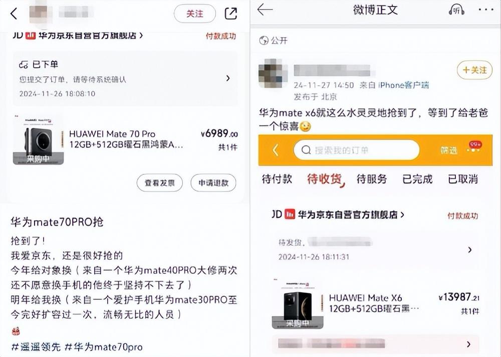 11月26日,华为Mate 70系列和华为Mate X6系列正式发布并开启全款预售,鸿蒙AI、红枫原色影像、卫星寻呼等功能让众多消费者眼前一亮,不少小伙伴已经迫不及待下单了,想要尽早开箱体验。发布会第二天已经有很多网友晒出了在京东成功下单华为Mate 70和华为Mate X6的截图,分享抢到新机的喜悦,表示就等着12月4日新机发货了。
