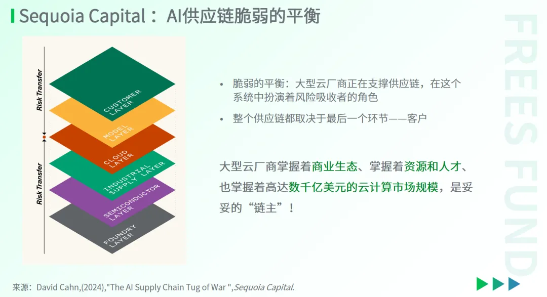 供应链的第六层,也就是最上层则是面向最终客户的应用服务商。尽管充满潜力,但他们依赖消费者和企业付费,当前市场规模有限,尚不足以支撑整个供应链的经济模型。这使得大型云厂商成为整个供应链最主要的风险承担者。作为AI产业的中枢,云厂商不仅掌握着庞大的商业生态和技术资源,还拥有数千亿美元的市场规模。正因如此,它们在产业链中的地位无可撼动,是毋庸置疑的“链主”。