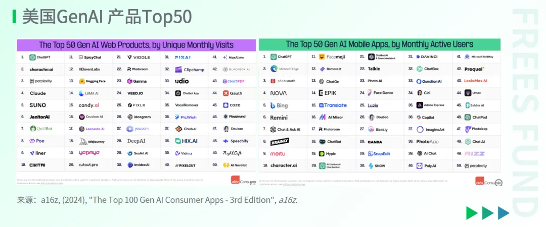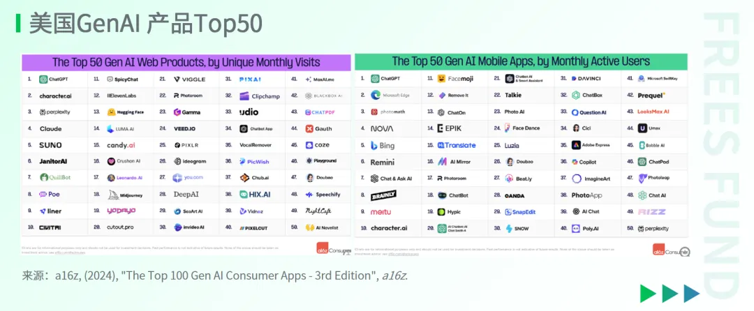当前美国月度访问的Top 50 AI应用中,除去部分偏ToC的案例(如Character.ai等),大多数属于ToP类型。