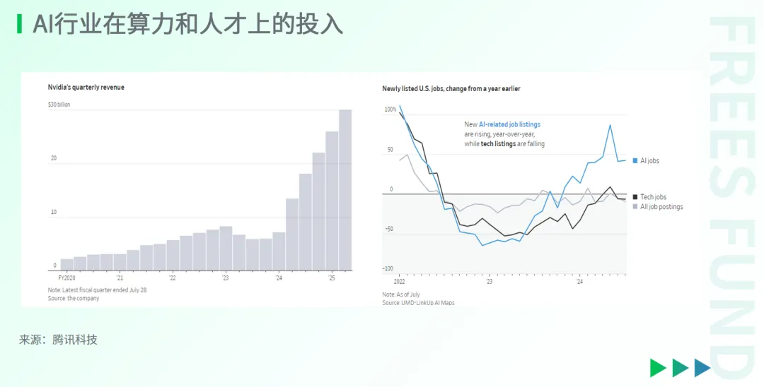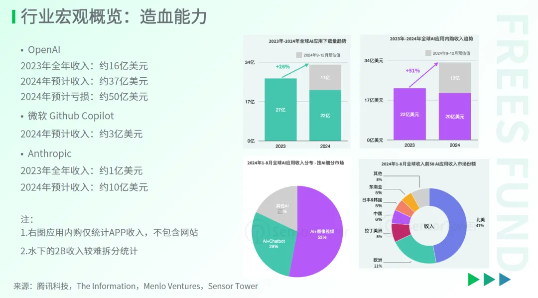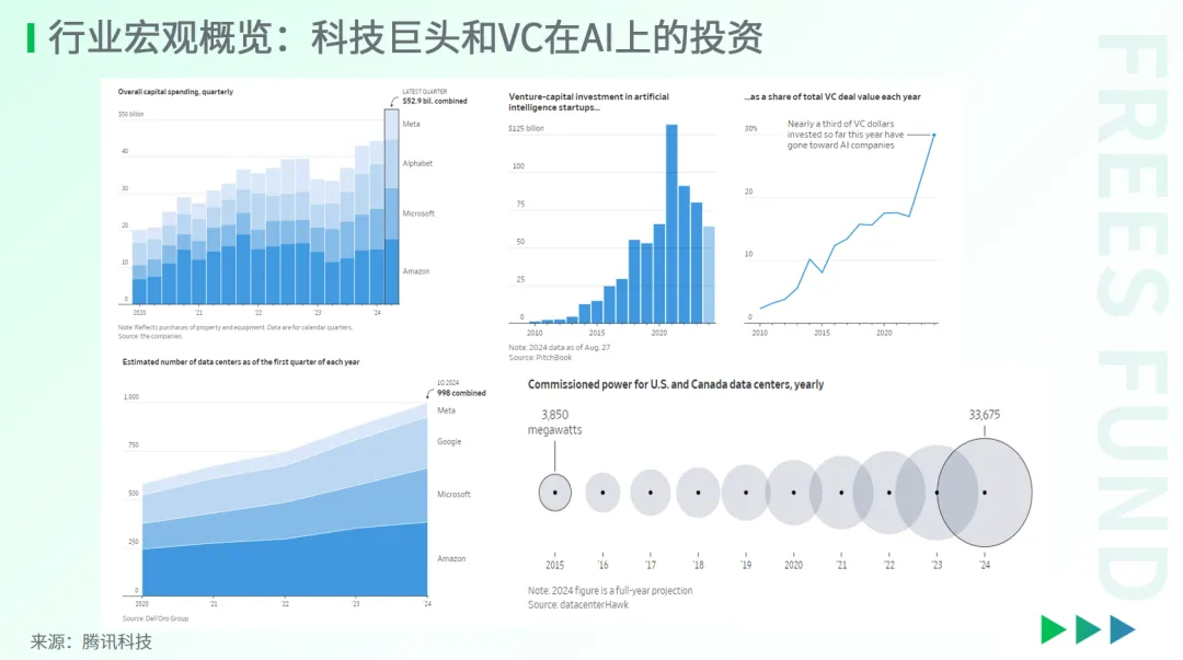 科技巨头和VC们在AI行业押注重金。根据腾讯科技的梳理,仅Google、Meta、微软和亚马逊四巨头在2024年Q2就投入529亿美金。截至8月底,AI创业公司已斩获高达641亿美元的风险投资。