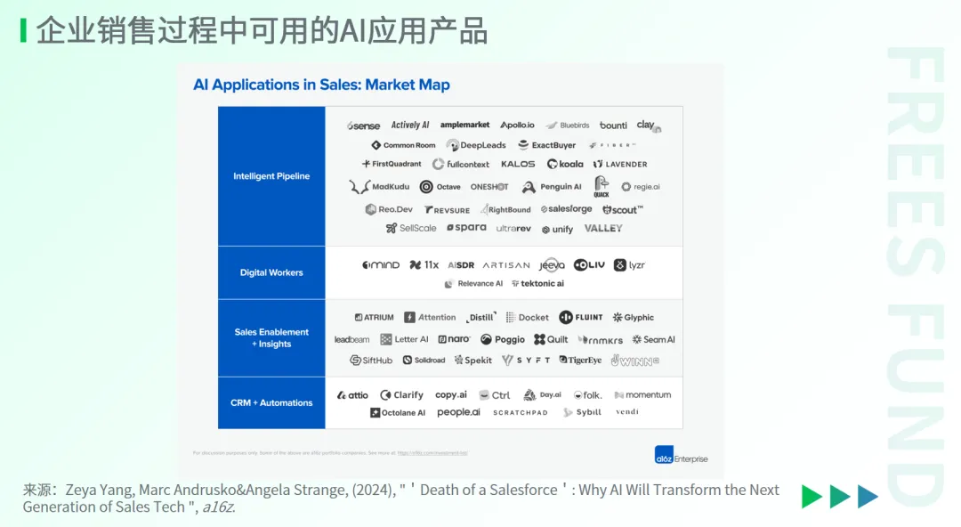 2024年7月,美国投资机构A16z发布了一篇文章《“Salesforce之死”:为什么AI将改变下一代销售技术》,深入探讨了人工智能在变革企业销售技术中的潜力。文章配图列举了一些可用的AI应用产品,其中大多数符合前述“独立业务模块”和“通用技能模块”的特点。