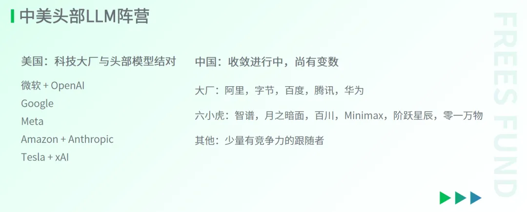 过去一年,美国头部大模型的阵营基本保持稳定,形成了“3+1+1”的格局:三家全球顶尖的闭源大模型公司(OpenAI、Anthropic和Google)、一家顶尖的开源大模型公司Meta,以及在特斯拉支持下紧随其后的xAI。此外,苹果等科技巨头未来也可能加入这一竞争行列,苹果自研的AFM模型已经被用于个人智能系统Apple Intelligence。