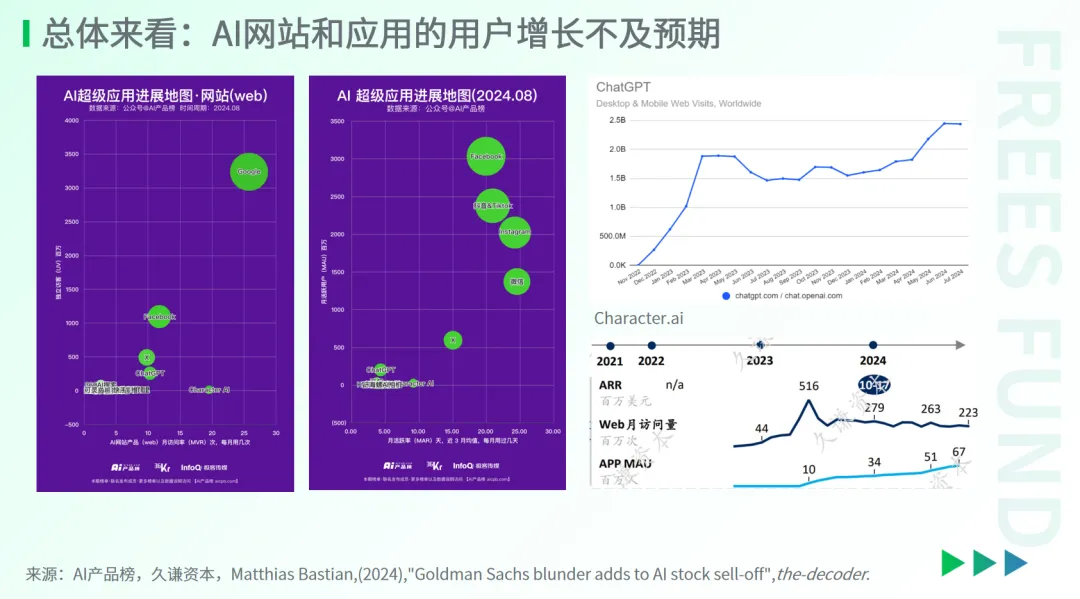 另一个用户访问量排名第二的知名应用Character.ai,自2023年下半年以来,网站流量增长也趋缓。如果行业头部应用在发展早期就面临增长瓶颈,可能意味着整个AI应用领域的发展压力比预期更大。