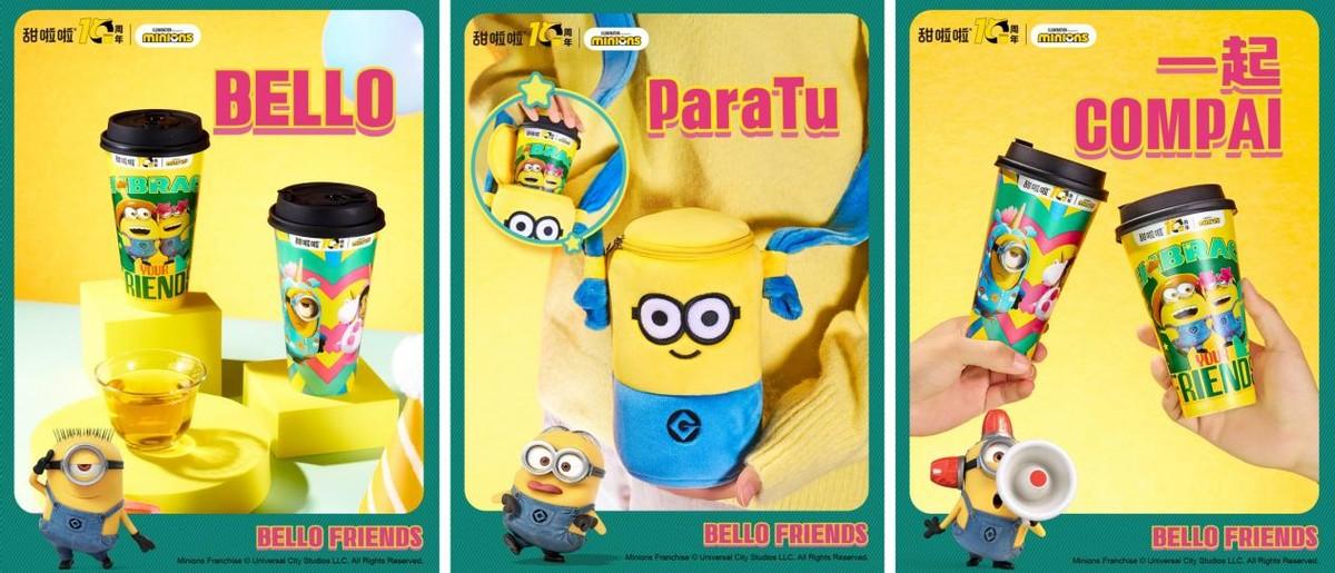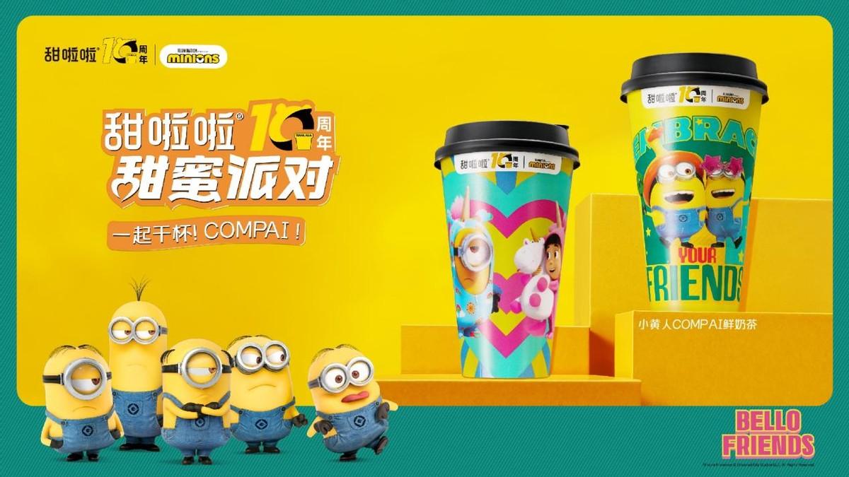 2024年11月29日,新茶饮品牌甜啦啦宣布与环球产品与消费体验旗下热门卡通品牌“小黄人大眼萌”联名,共创全新饮品小黄人COMPAI鲜奶茶。据悉,“COMPAI”在小黄人语言体系中意味“干杯”,临近甜啦啦品牌十周年之际,特别选用产自云南的蜜香珍芽茶叶为原料,携手萌趣“小黄人”与消费者共同举杯,奔赴一场甜蜜快乐的茶饮之旅。