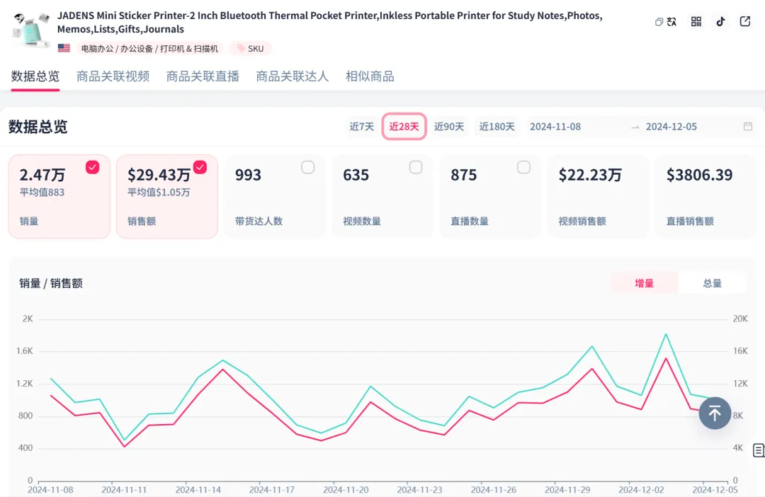 TT123经观察发现,在TikTok美区,一款迷你贴纸打印机在近期的销量出现了明显上升趋势。根据FastMoss数据,在过去的28天售出了2.47万单,成为TikTok美区电脑办公品类销量榜第四名。
