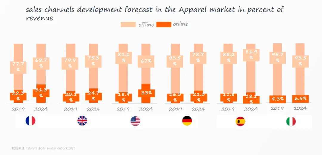 服装线上销售表现持续强劲,女装线上销售占比逐步扩大,预计到2024年,美国、法国、英国、德国的服装电商收入占比将位列前四。