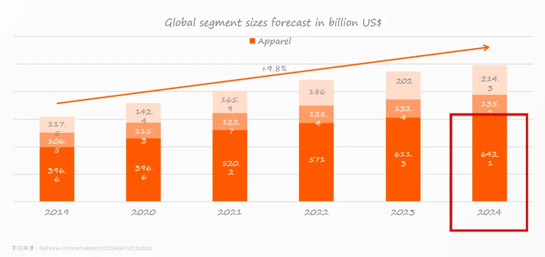 服装是时尚品类电商领域最大的一块蛋糕,预计到2024年,全球服装电商收入将达到6,421亿美元,占时尚品类电商收入的64.8%。