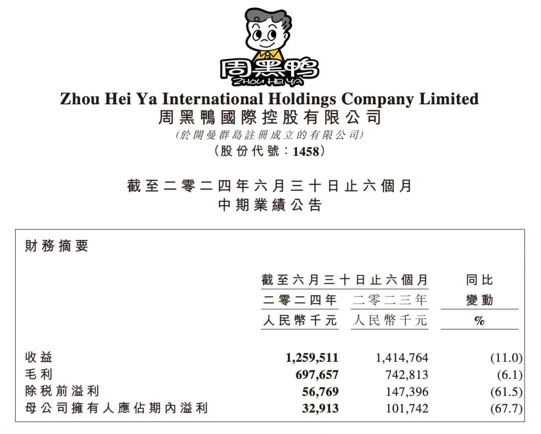 作为休闲卤味龙头企业之一,今年上半年周黑鸭实现营收为12.60亿元,同比下滑11%,期内溢利为3291.3万元,同比下滑67.7%。