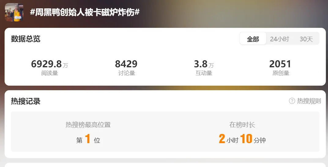 12月11日,话题“周黑鸭创始人被卡磁炉炸伤”登上微博热搜第一。周黑鸭(01458.HK)创始人周富裕曾发视频称,前几天自己在户外用卡磁炉烧开水的时候遇到爆炸被炸伤,之后去医院接受治疗。