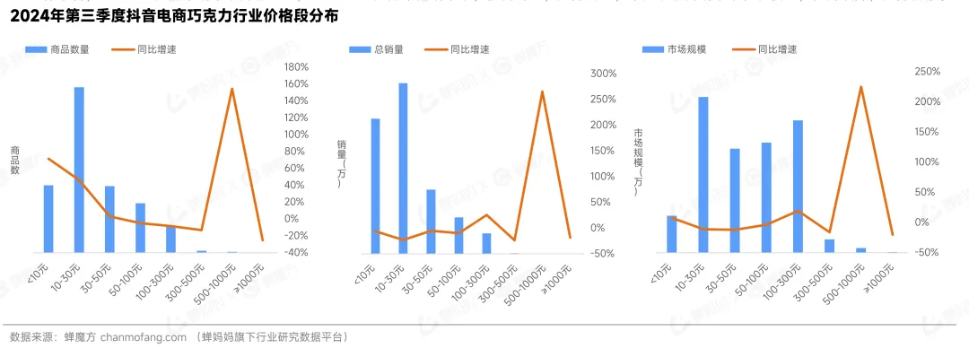 在供给角度,0-50元价格区间的商品数量最多且同比增速高,显示供给充足且增长迅速,500-1000元的中高端区间商品同比增速较高,1000元以上的高端商品数量少且负增长,供给有限。