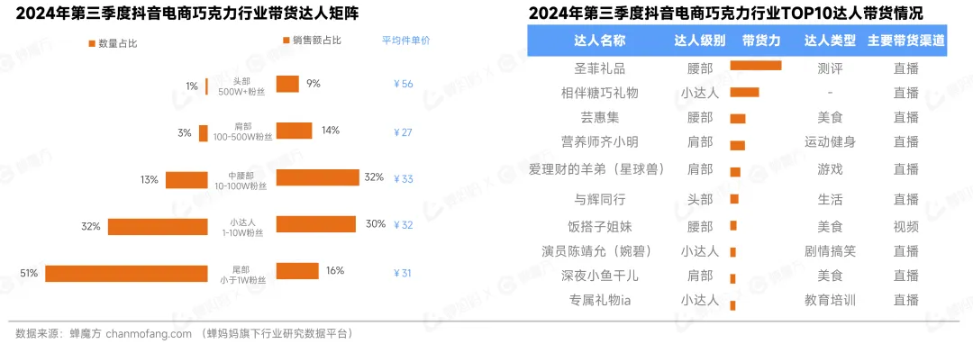 在销售额占比方面,中腰部达人表现最为出色,其次是小达人。从平均件单价来看,头部达人的价格最高,为56元,而小达人为32元。TOP10达人中,肩部、腰部、小达人级别的达人数量最多,美食类达人数量最多。