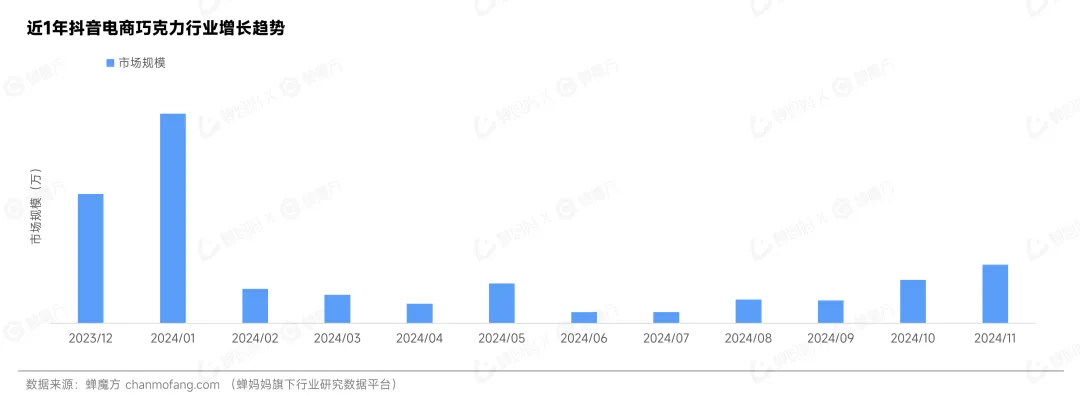 从图表中可以看出,抖音电商巧克力行业市场规模在近一年经历了几轮波动。