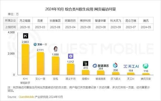 在移动端 AI 原生应用方面,同样是截止到 10 月,行业月活规模总数达到 8976 万,同比增长 373%,其中,豆包、Kimi 智能助手、文小言月活跃用户分别为 4839 万、1650 万、1179 万,也就是说,网页端 Kimi 占优,而豆包在移动端占优,文小言居中。