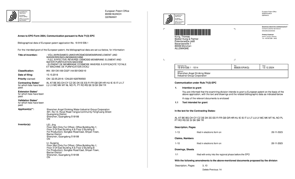近日,安吉尔收到欧洲专利局(EPO)正式通知,安吉尔自主研发的专利长效反渗透滤芯——“全效反渗透膜元件及纯水机”获欧洲发明专利,这是该技术继获得中美日韩发明专利之后取得的又一项国际专利证书,至此该技术已获得全球五大专利局发明专利。这一成果不仅彰显了安吉尔在净水科技领域的领先实力,也标志着安吉尔在全球知识产权布局上又迈进了重要的一步。