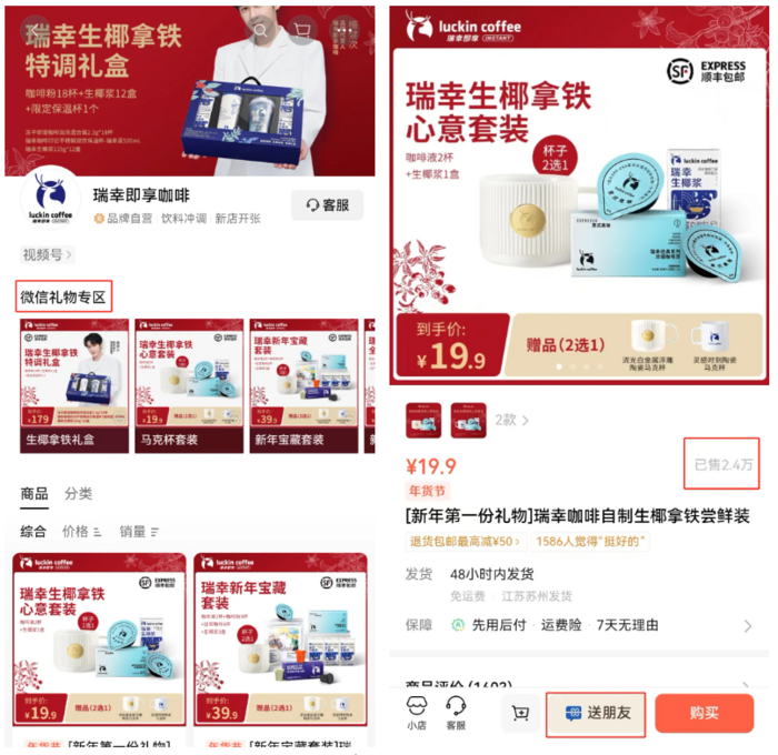 商家的反应也同样迅速。2024年12月30日,首个微信小店“送礼”标杆案例诞生——瑞幸咖啡,推出新年送微信礼物活动,三款产品价格分别为19.9元、39.9元和179元,单日订单1万多单。据媒体报道,瑞幸咖啡有意借此测试整个运营链路,并了解用户反馈,为接下来的春节送礼做准备。