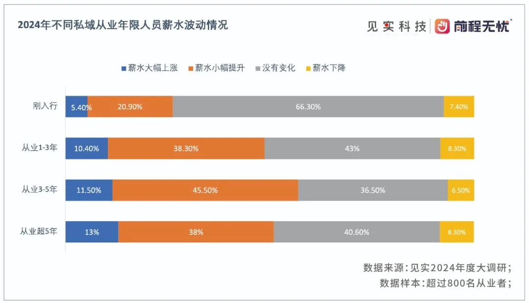 见实团队还特别查看了不同从业年限的人群中,薪水变化情况。