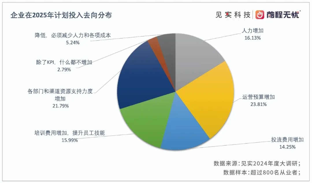 另外还有20.82%的调研用户表示资源没增加(当然,KPI是必须要增加的),还有8.24%的参与调研用户认为投入反而变少了。