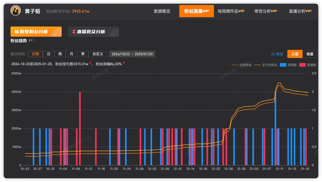 整个2024年,黄子韬的抖音账号涨粉2747.3万,势头比老板顶流雷军还要猛,其中大部分是年末那几天涨的。