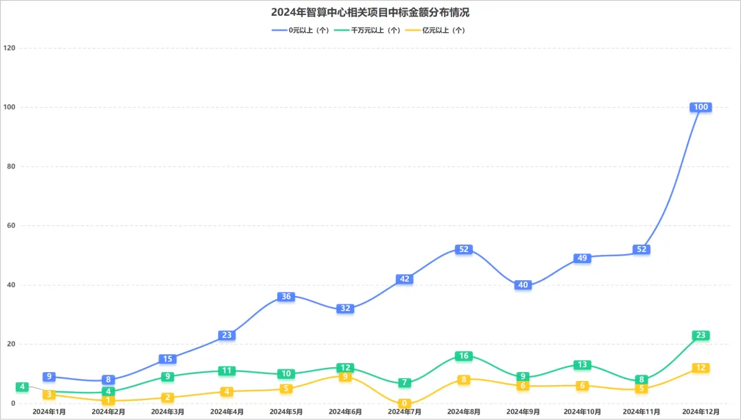2024年的公开招投标市场上,智算中心相关的各类中标项目,始终呈现着阶梯式上升状态,基本每个季度都会向上跳跃一个新台阶,至2024年12月,单月中标项目数已经摸高到至少100个。
