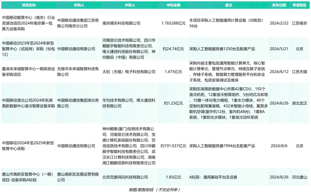 这些亿元级别的大单,很大一部分来源于对各种设备的采购,尤其是运营商的算力设备采购项目,如“中国移动2024年至2025年新型智算中心采购”项目,价值高达191亿元,是去年中标金额最高的一个智算中心相关项目。