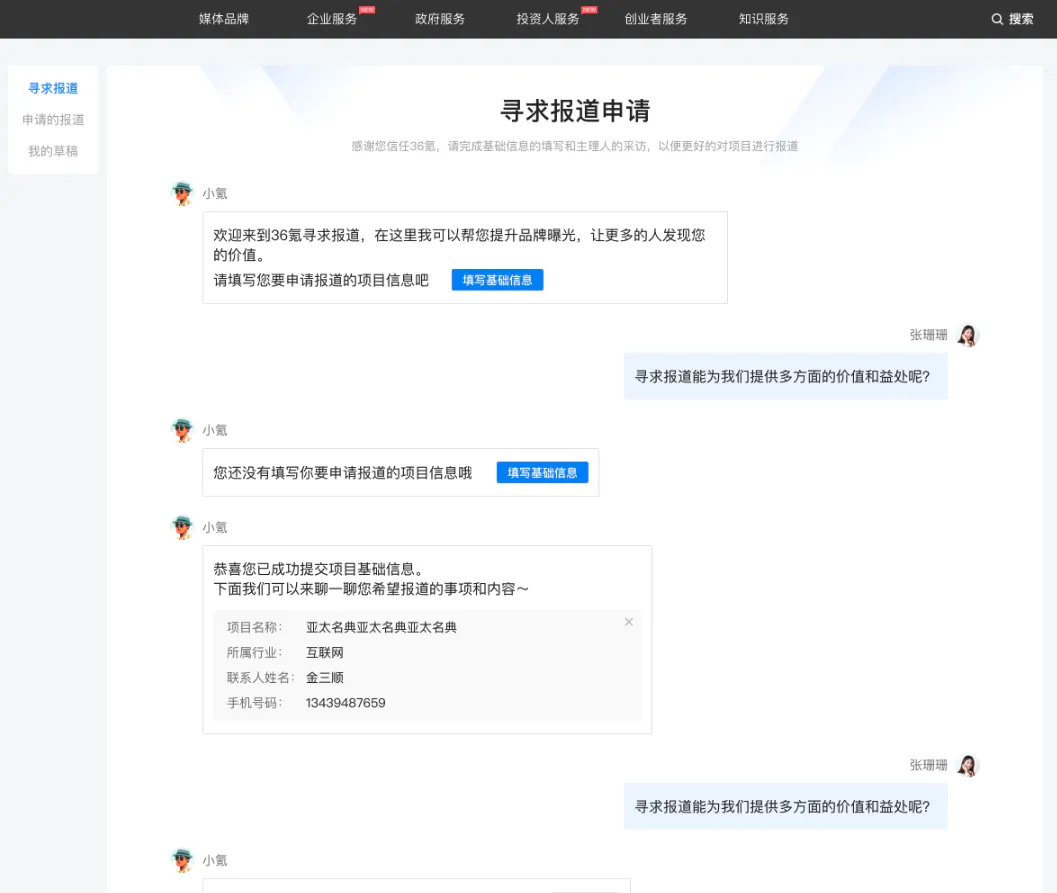 所有希望通过36氪取得项目报道、发布融资需求的用户,只需进入36氪APP首页底部“寻求报道”页面,根据智能机器人小氪的引导填写信息,小氪即可帮助用户快速生成相应报道。文章生成后,稿件会进入人工审核阶段,通过审核的稿件将会发布在36氪的“自助报道”栏目,依托36氪主站流量为企业提供曝光(该功能在36氪官网也提供了相应的PC端入口)。