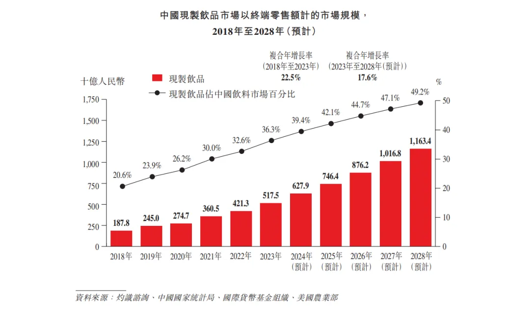 数据还显示,到2028年,中国现制饮品市场以终端零售额计的市场规模预计达11634亿人民币,将成为与预包装饮料并列的万亿级市场。