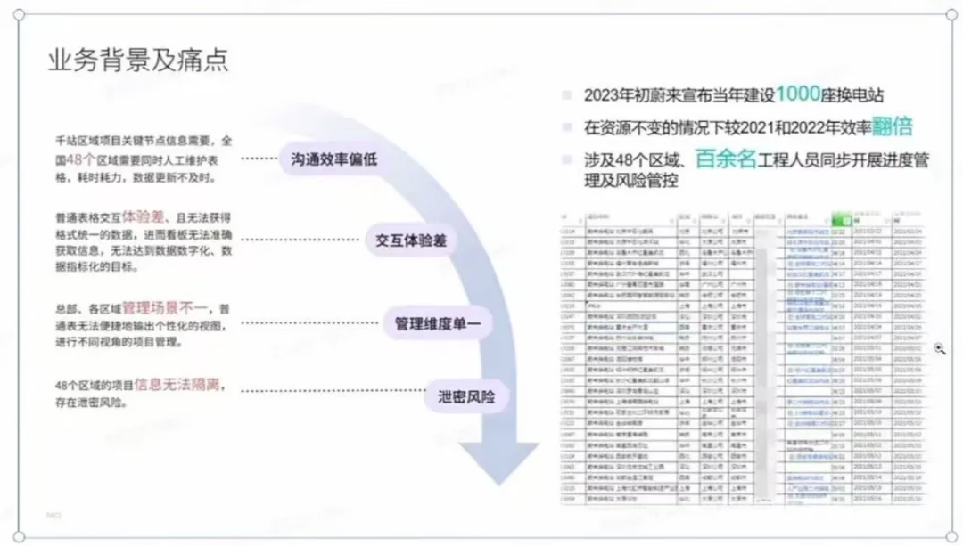 李钦钦记得,2023年,蔚来宣布要建设1000座换电站,当时建设团队的压力很大,面临资源不变的情况下,整体效率要翻倍。当时全国48个区域公司,大概100多名工程人员,通过普通线下表格,同步项目进度。