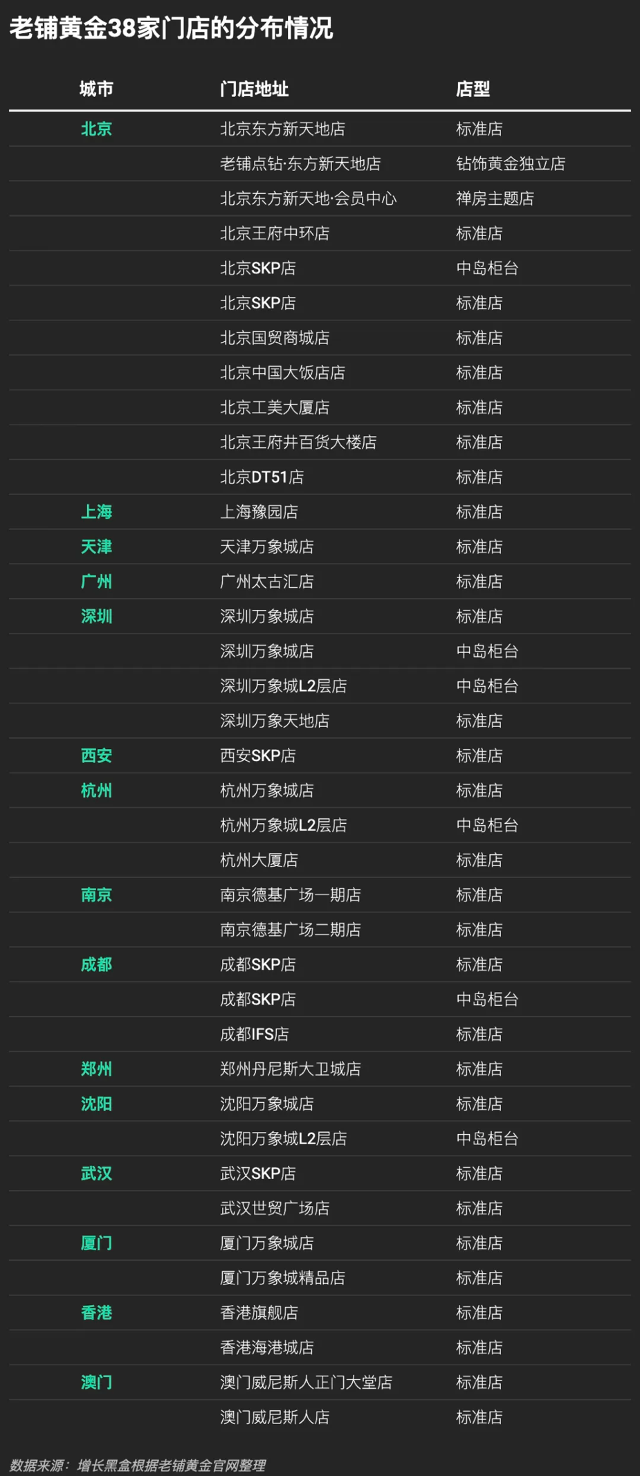 而且值得注意的是,目前老铺黄金的38家门店中,有一部分中岛柜台店,这类装修相对简单、成本更低的店型,通常是许多品牌以低成本入驻新商场的一种选择,但老铺黄金几乎所有中岛柜台店都是搭配标准店一起开在相同高档商场,包括北京SKP店、成都SKP店、深圳万象城店、杭州万象城店、沈阳万象城店。