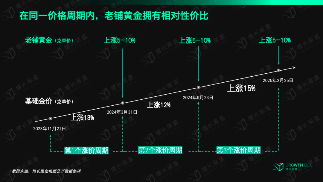 类似的情况也存在于2024.3.31-2024.9.23,以及2024.9.23-2025.2.25这两个周期,基础金价分别上涨12%、15%,而老铺黄金依然维持价格不变,直到某个节点宣布涨价。甚至对比基础金价10-15%的涨幅,老铺黄金5%-10%的涨幅还要更小。