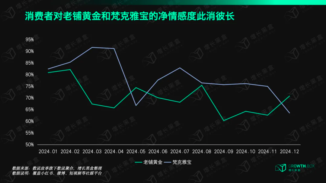 以梵克雅宝为例,数据显示,2024年老铺黄金与梵克雅宝的消费者净情感度呈现此消彼长的态势,而且梵克雅宝的社交媒体声量自2024年初高点不断下滑,老铺黄金则不断攀高。此前关注梵克雅宝等品牌的中产消费者开始关注老铺黄金,大有直接竞争之势。