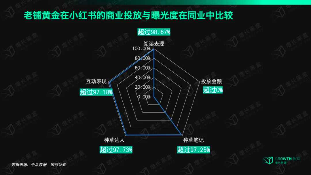 国信证券最新的研报也指出,虽然老铺黄金在小红书上的商业投放金额不及同行,但其在小红书上的种草笔记数量、笔记互动表现、阅读表现却超过了约97-99%的同行。[3]这足以说明,老铺黄金在线上的品牌声量并非花钱投放带来,而是“自来水”。