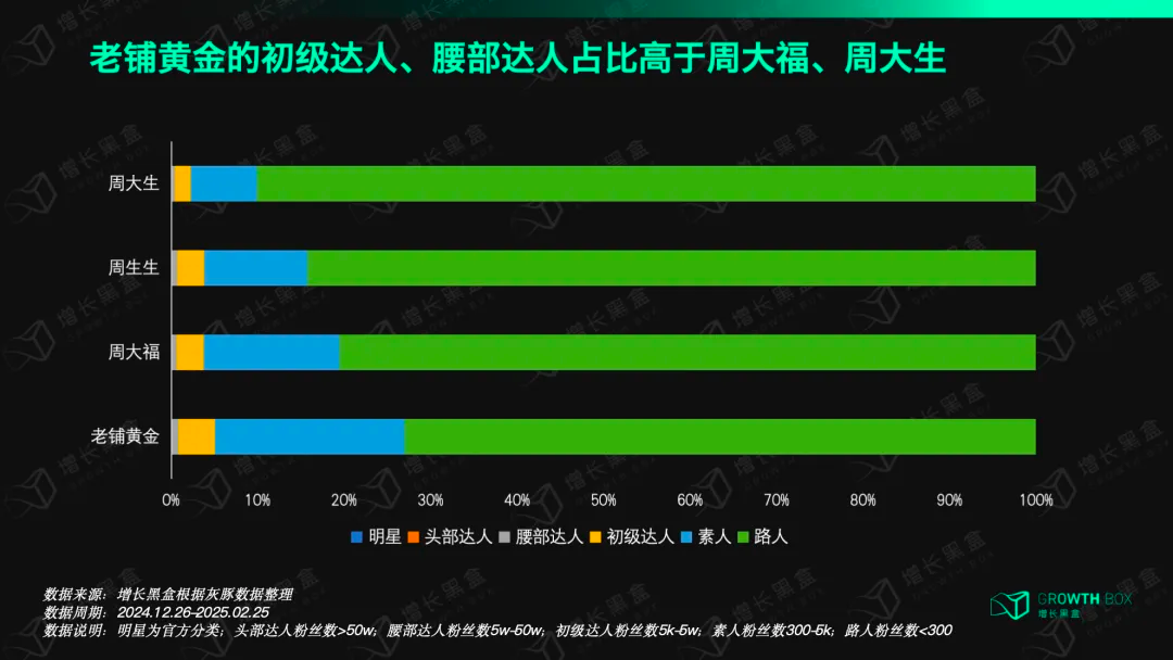 值得注意的是,虽然没有投放商业达人,但老铺黄金的初级达人、腰部达人占比却高于周大福、周大生、周生生等高投放品牌。这意味着,这些初级、腰部达人也是“自来水”。