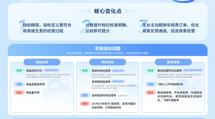 在“物流体验”考核上,新增了揽收时效达成率,保留了运单配送时效达成率,删除了24/48小时支付-揽收率、发货问题负向反馈率和订单配送时长考核。