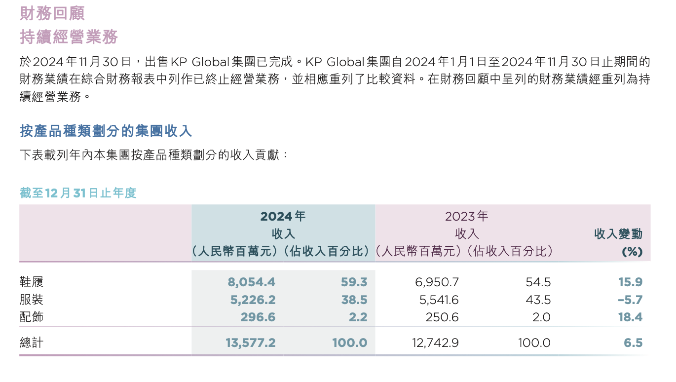 第一,特步鞋类产品营收占比逐年提高,2024年同比增长15.9%至80.54亿元,约占总收入的59.3%。与此对比,服装产品收入同比下跌5.7%,52.26亿元收入约占总收入的38.5%。
