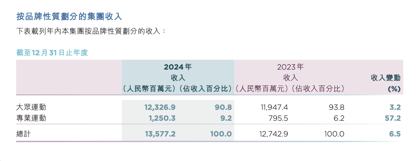 从2024年年报中可以看到,特步主品牌仍是特步集团核心业务支柱。特步主品牌所在的大众运动分部营收达123.27亿元,占集团总收入超90%,较2023年的118.47亿元增长3.2%。那么,特步业绩的“稳”来源于哪儿呢?