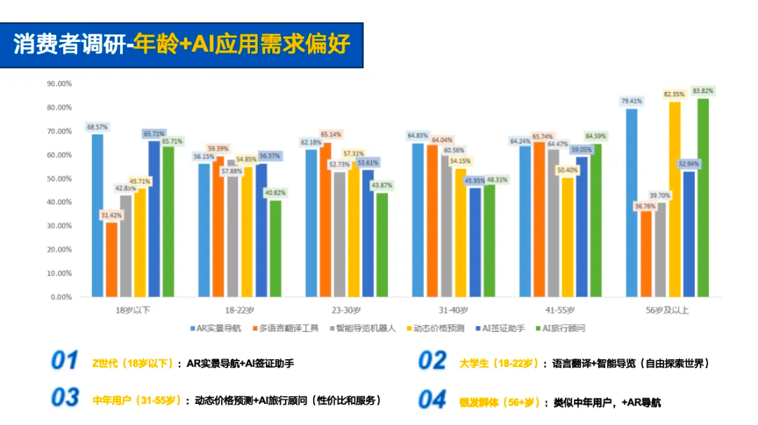 Z 世代(18 岁以下):偏好 AR 实景导航+AI 签证助手,显示出对科技感强的产品兴趣。