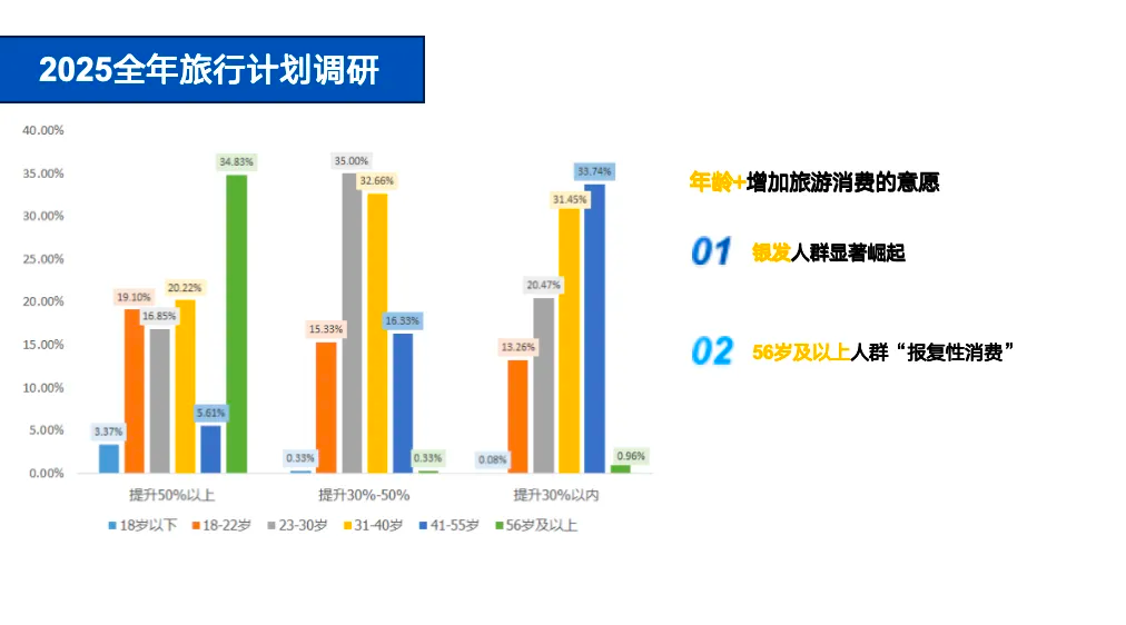我们的分析结合了年龄层分布和旅游消费意愿,得出的结论非常直观:在愿意提升旅游预算50%以上的人群中,56岁以上的银发群体占比明显领先。这表明,银发人群既有钱有闲,又愿意为旅游投入更多预算,对未来市场布局有重要的指导意义。