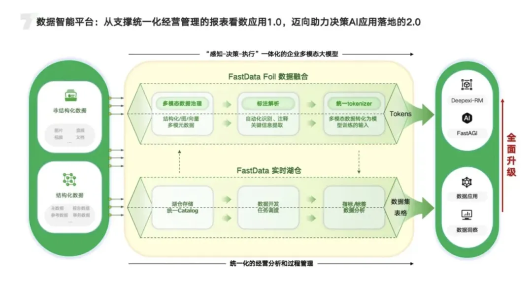之前的数据平台处理业务系统的数据能力已经达到极致,原有的数据治理体系对于结构化数据已很完善,产生的数据表、指标集等结果可以实时高效的服务各种BI或数据应用。但AI的发展可以使得企业更大量的知识、业务逻辑、图片等信息发挥价值,在面向智能化应用时代,数据平台面临着解决从存储到对应的解析以及治理等难题、实现统一的多模元数据、建立自动化的智能识别和信息提取能力、利用数据合成为大模型提供高质量的融合数据等,数据平台的数据技术栈需要再次深度升级。这些认知磨砺最终实现了滴普科技数据平台的重大升级,形成了FastData Foil版本,实现了多模态数据的统一管理,并兼容经典数据应用输出和tokenize的数据以支撑模型的训练。