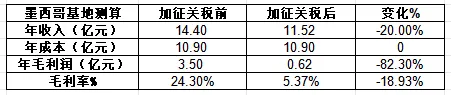 图:考虑关税影响后对墨西哥工厂收入和毛利润影响测算 数据来源:爱柯迪公告,36氪整理