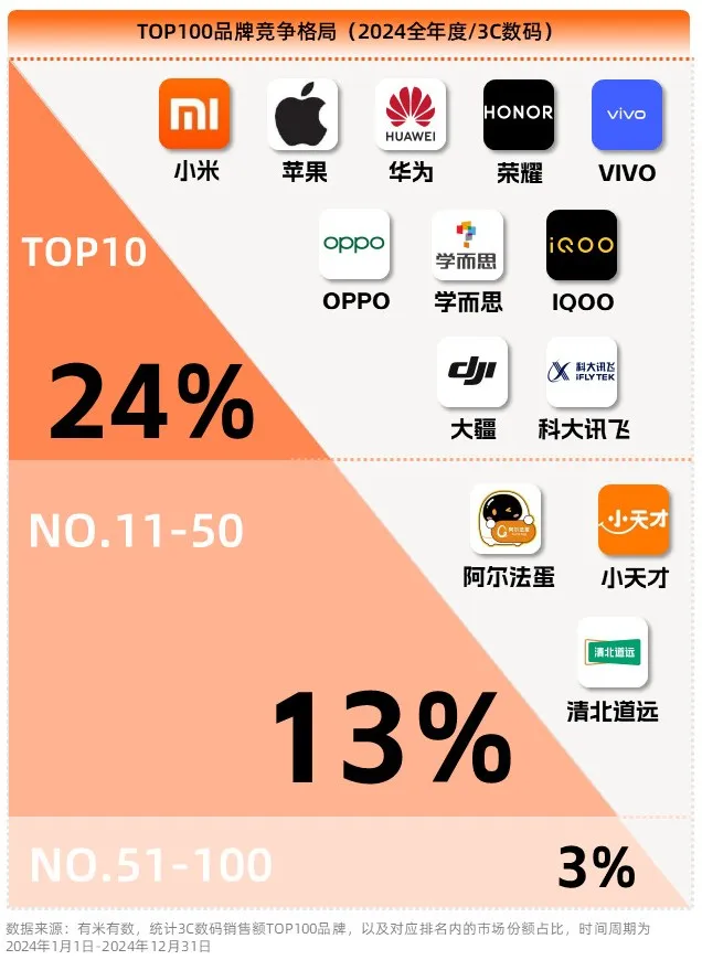 这里有两个明显特点:手机品牌垄断前六,教育硬件(学而思)、无人机(大疆)等垂直品类挤入前15,凸显特定场景产品的突围优势。