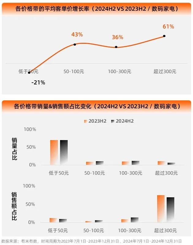 在50元以下的数码家电市场,数据线、手机支架等低价配件,卖得多但赚得少(客单价降21%),主要因为用户只在需要时才买。