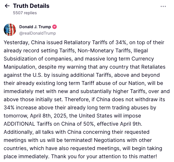 1. 特朗普在Truth Social上宣布,如果中国在2025年4月8日前不撤回34%报复性关税,美国将从4月9日起对中国征收额外50%关税。