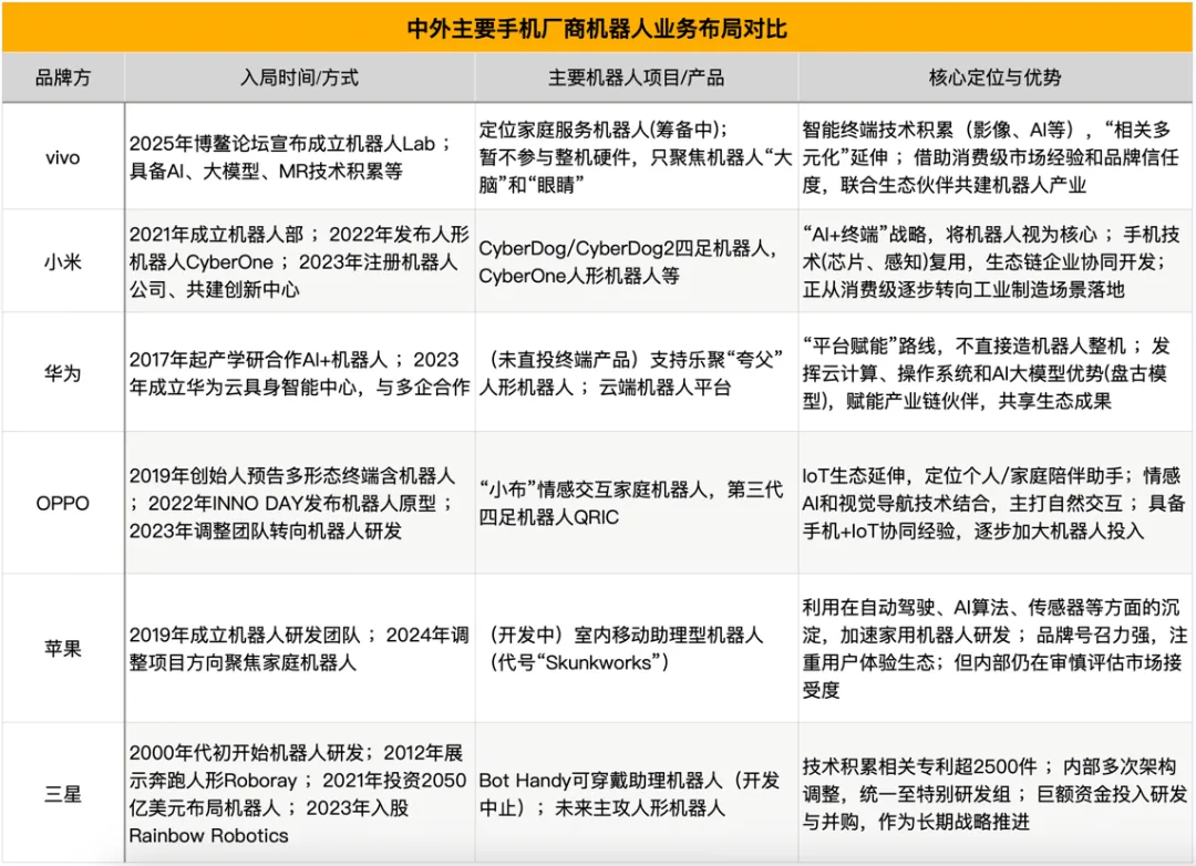 一方面,手机供应链上的许多元器件(如摄像头模组、雷达、伺服电机、电池管理等)在机器人上同样适用甚至需求更高,这为手机厂商赋能上下游提供了机会。另一方面,提前卡位机器人赛道,也是在为未来可能出现的“融合竞争”做准备——毕竟,若有朝一日机器人真的成为像智能手机一样普及的个人终端,今天的手机巨头们要么成为明天机器人市场的领军者,要么就会面临被新巨头颠覆的风险。