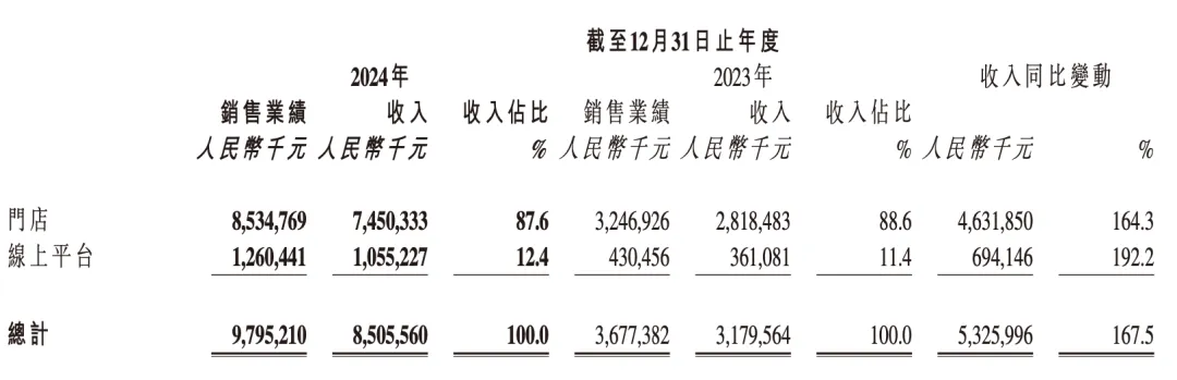 老铺黄金的销售以线下门店渠道为主。去年老铺黄金来自线下的收入约85.35亿元,同比增长164.3%,占总收入的87.6%;线上平台收入约12.6亿元,同比增长192.2%,约占总收入12.4%,2023年占总收入11.4%。