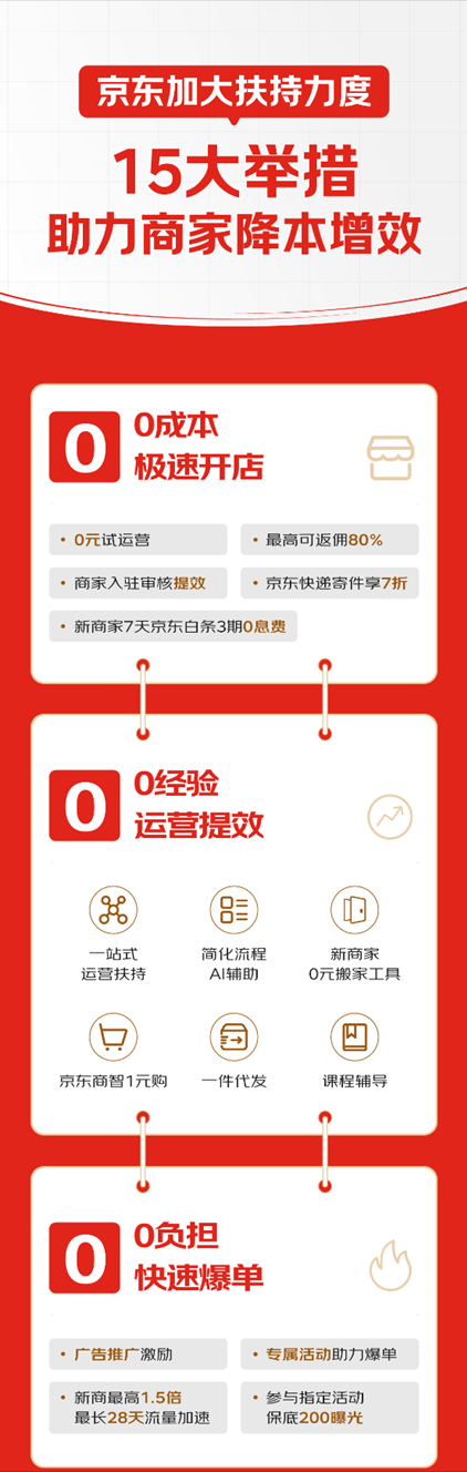 各平台流量红利见顶、投流推广费用高企、行业竞争激烈利润承压………当前,电商领域的一些痛点,让商家面临不小的压力。不过,最近广大商家迎来了好消息,京东一口气推出15项扶持商家的大礼包,覆盖开店、发品、动销和起量多个关键环节,帮助商家简单开店、轻松挣钱。